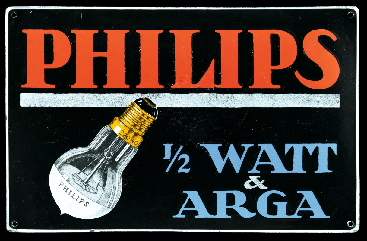 Das Unternehmen Philips & Co. Wurde 1891 im niederländischen Eindhoven gegründet und zählte neben Osram zu den großen Profitören des Aufschwungs der Elektroindustrie. Dieses Emailschild zeigt eines der ersten Produkte. 1915 kommt diese Neuheit, eine mit Argon gefüllte Glühlampe auf den Markt. Das Schutzgas sorgte für eine längere Lebensdauer des Glühfadens und stach so aus der Konkurrenz hervor. Mit dem Slogan „So hell wie die Sonne!“ wirbt das Unternehmen seiner Zeit dafür und legte somit die Grundsteine zum Aufstieg eines heutigen Weltkonzerns.